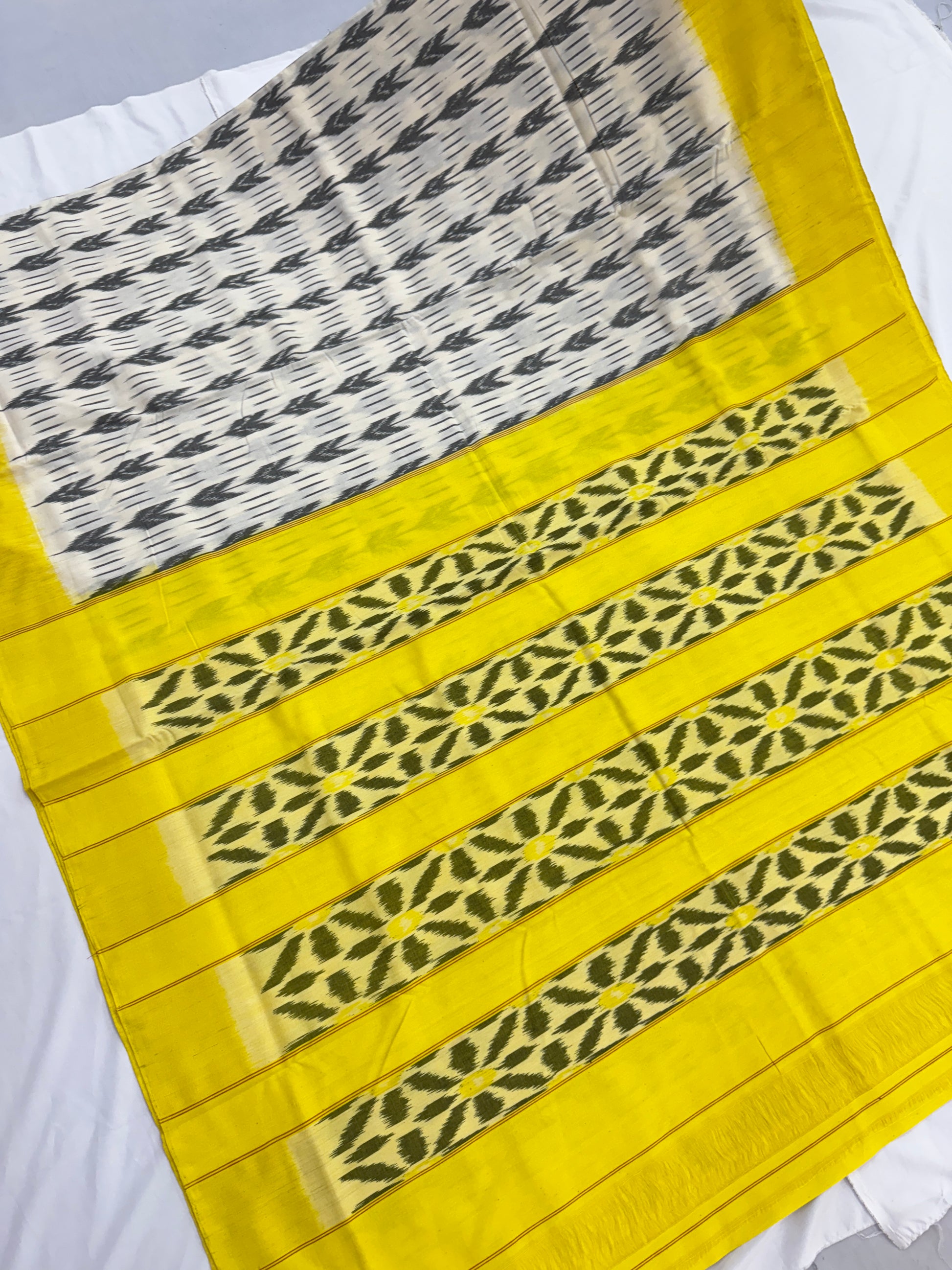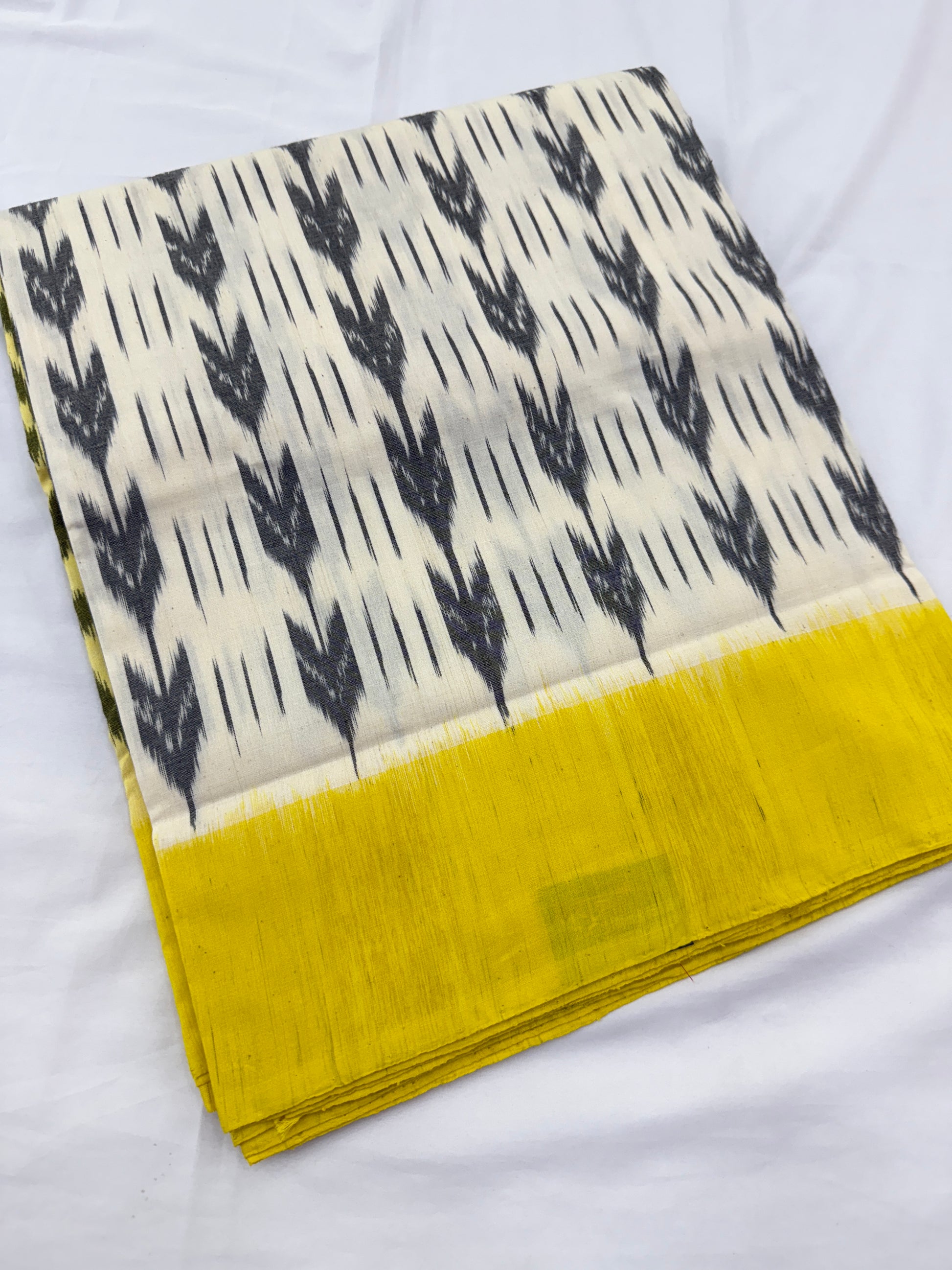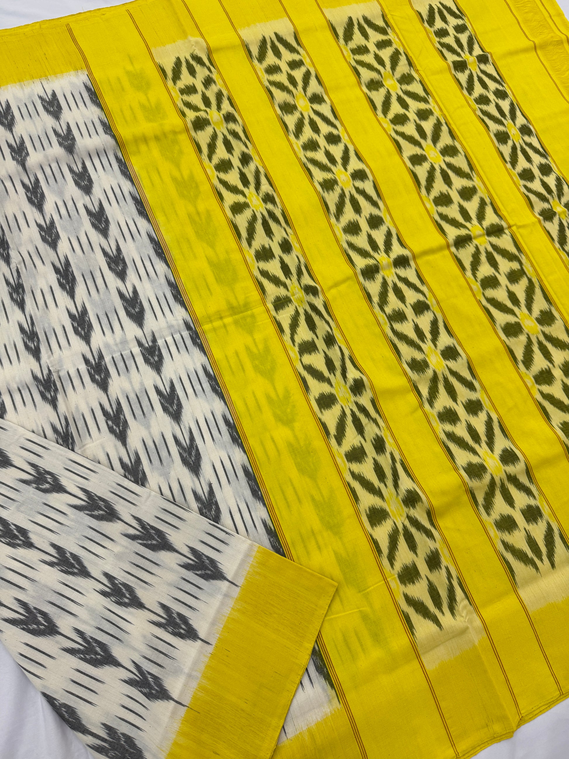 Elegant single Ikat saree handwoven by skilled artisans using traditional techniques. Showcasing distinct patterns and vibrant colors, this saree is a perfect blend of heritage and style.