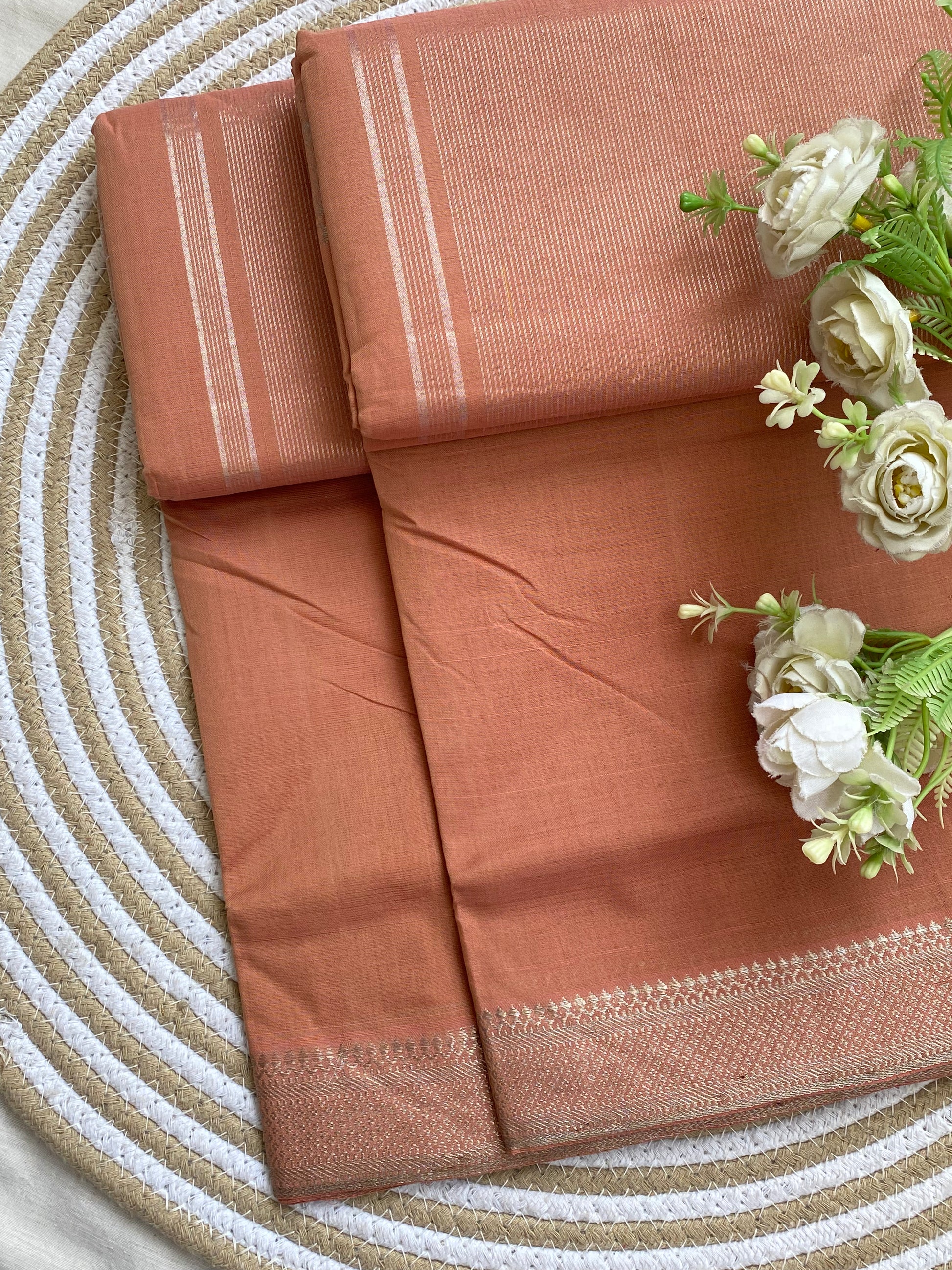 Each saree is handwoven by skilled artisans. Minor knots, weave variations, or slight irregularities are natural characteristics of handloom weaving and are not considered defects. These details make every piece unique and authentic.