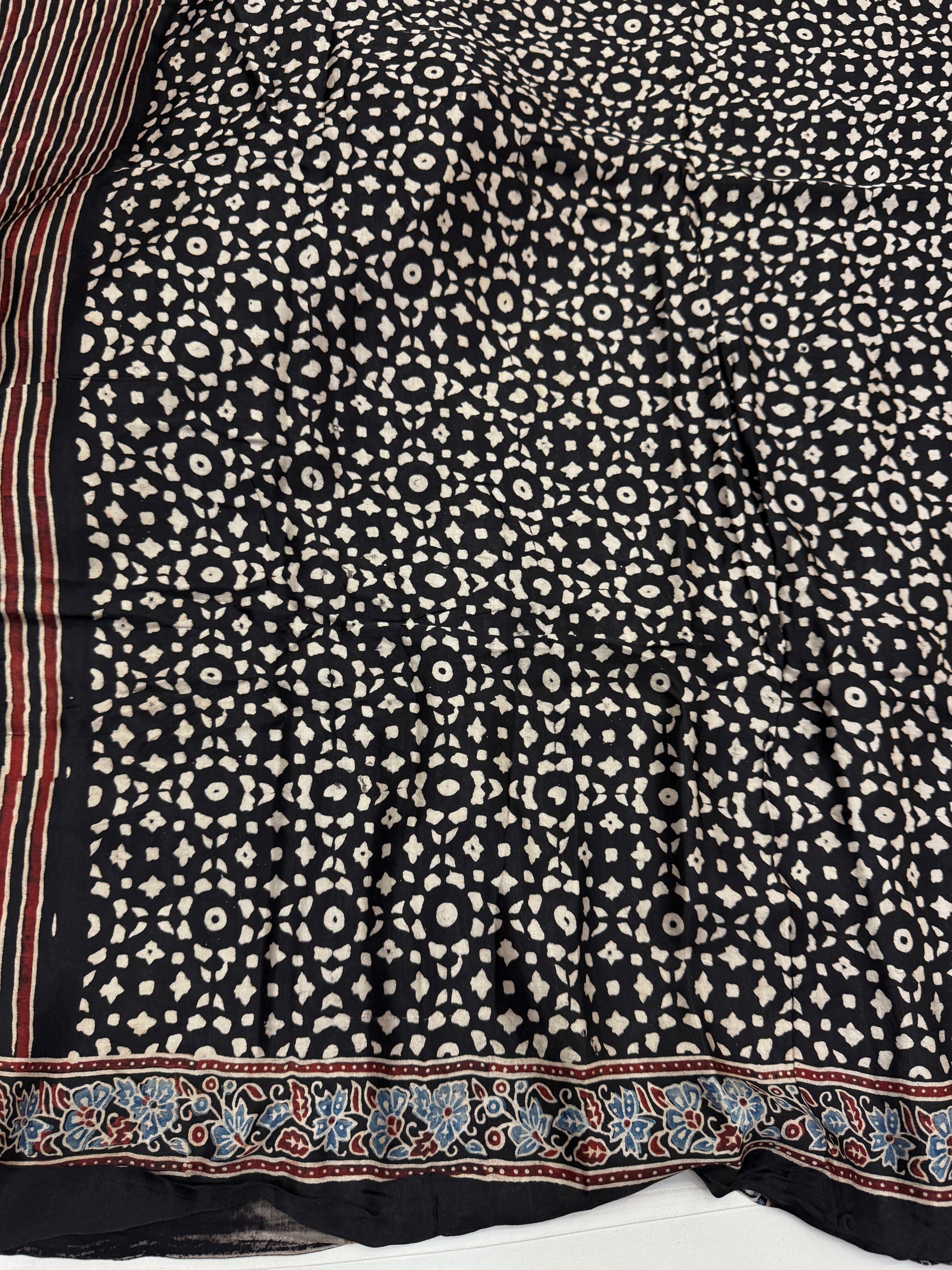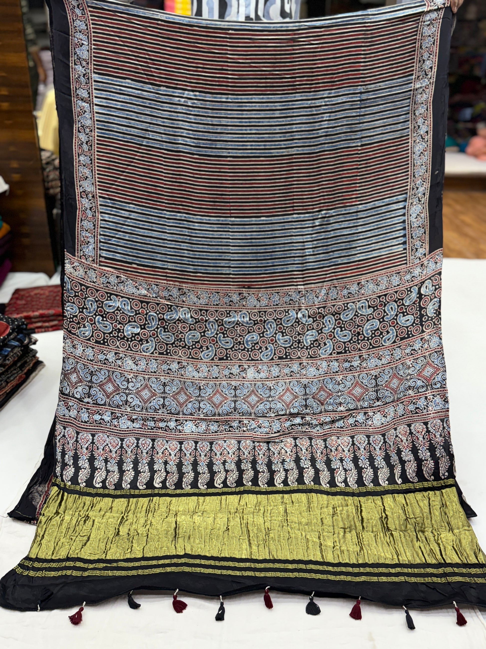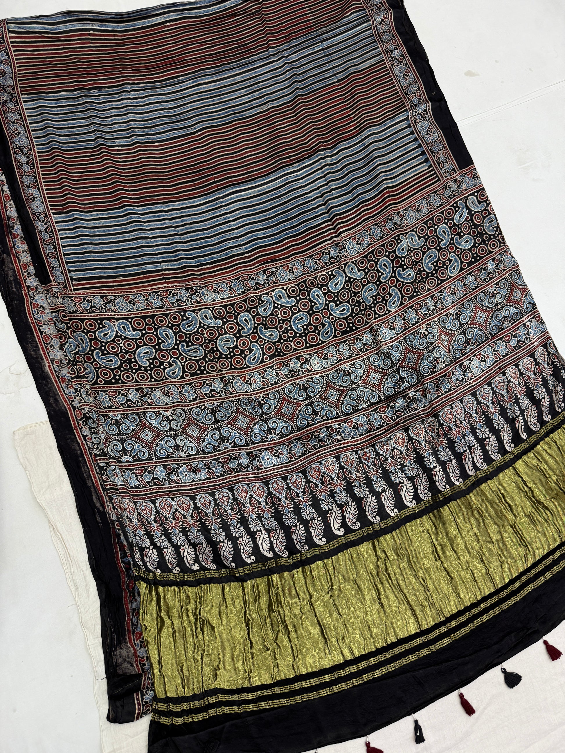 Natural dyed ajrakh modal satin silk saree with lagdi zari pallu.