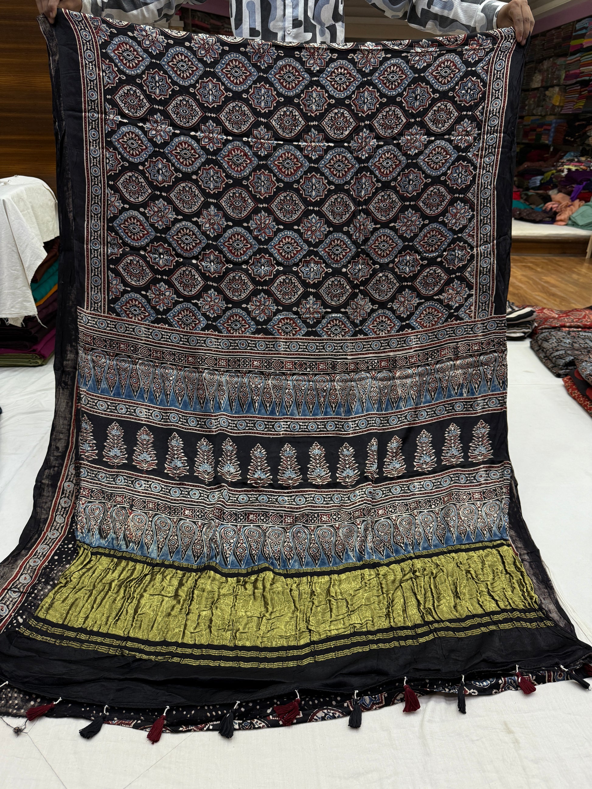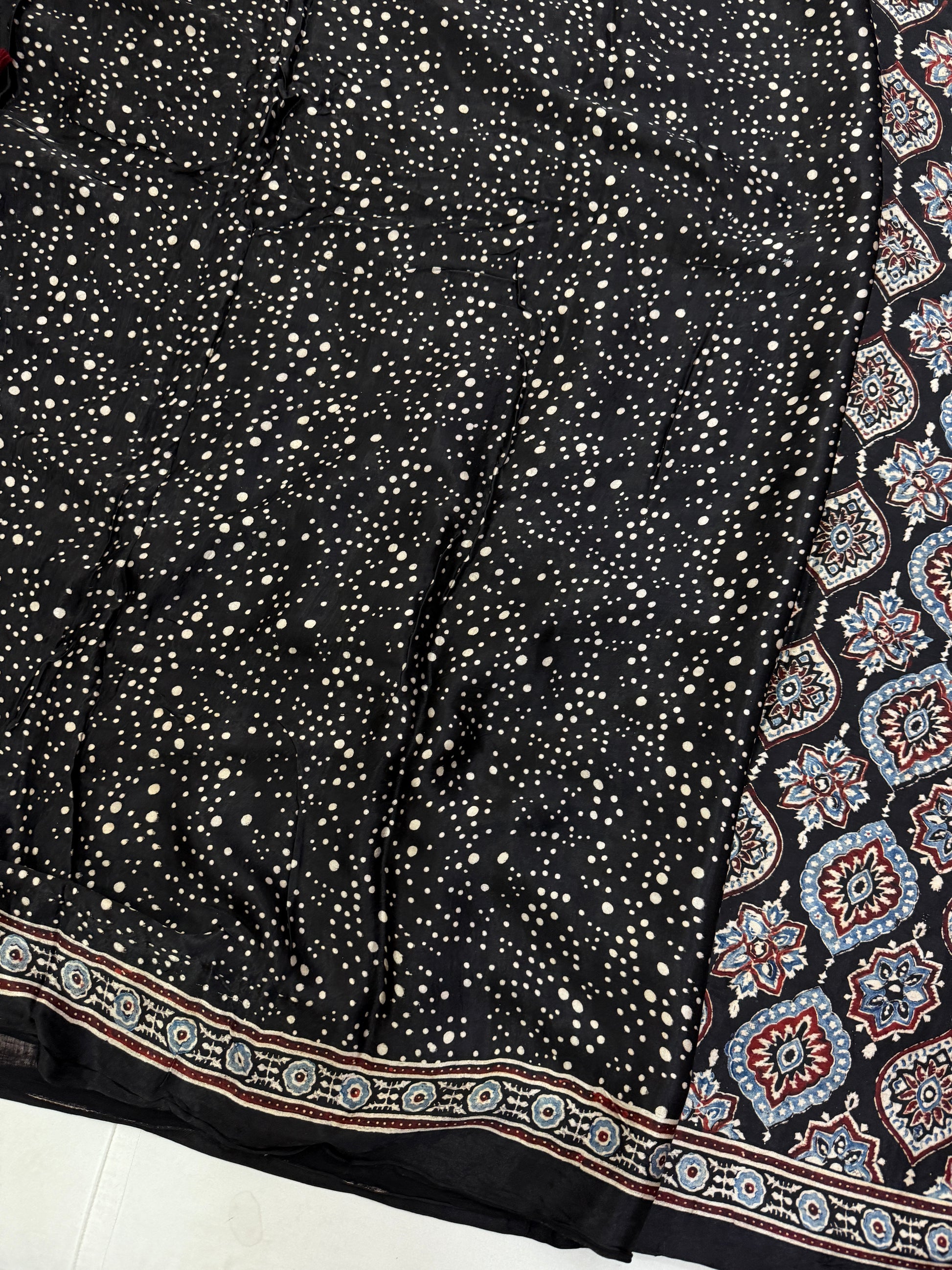 Natural dyed ajrakh modal satin silk saree with lagdi zari pallu.