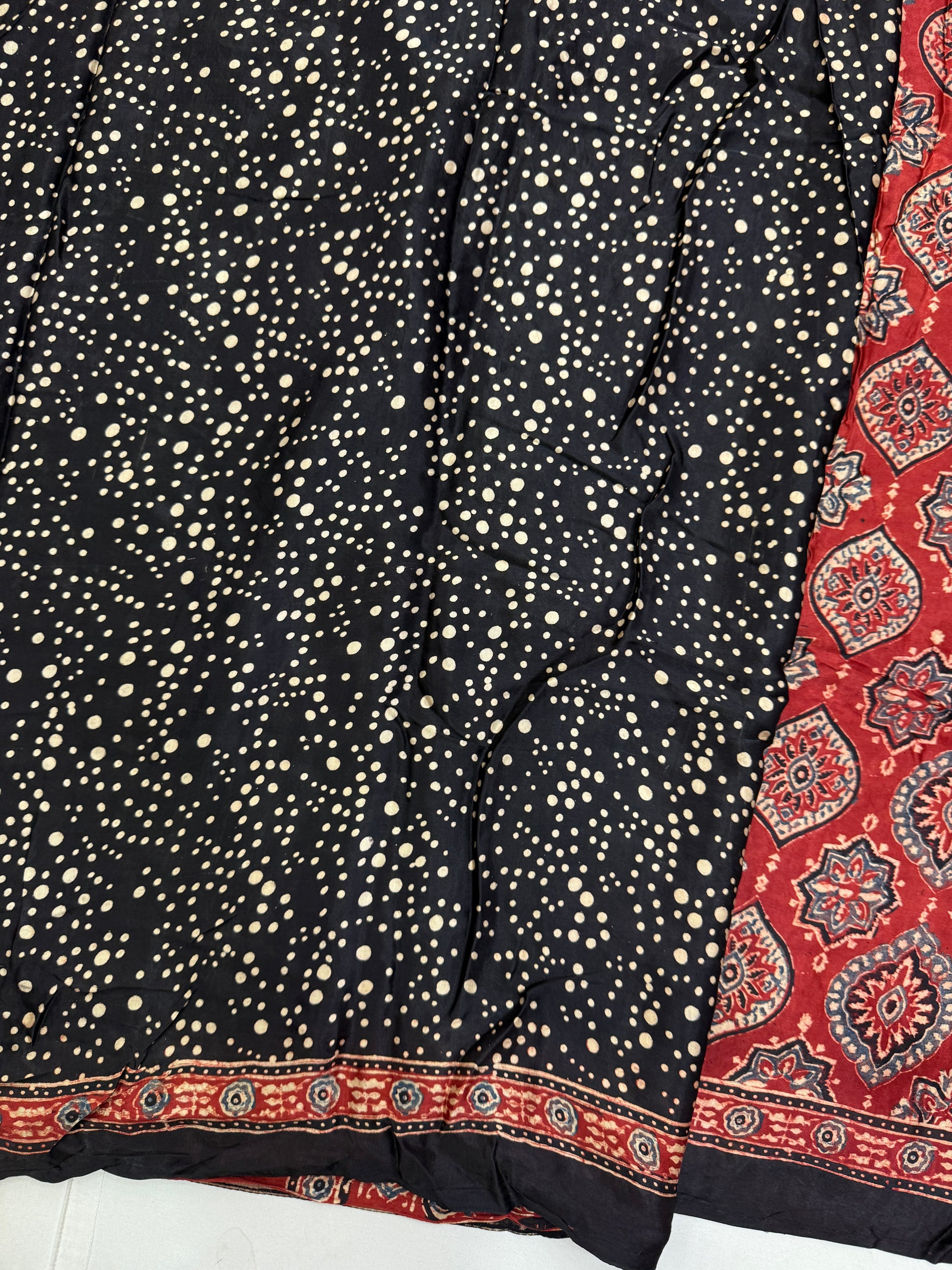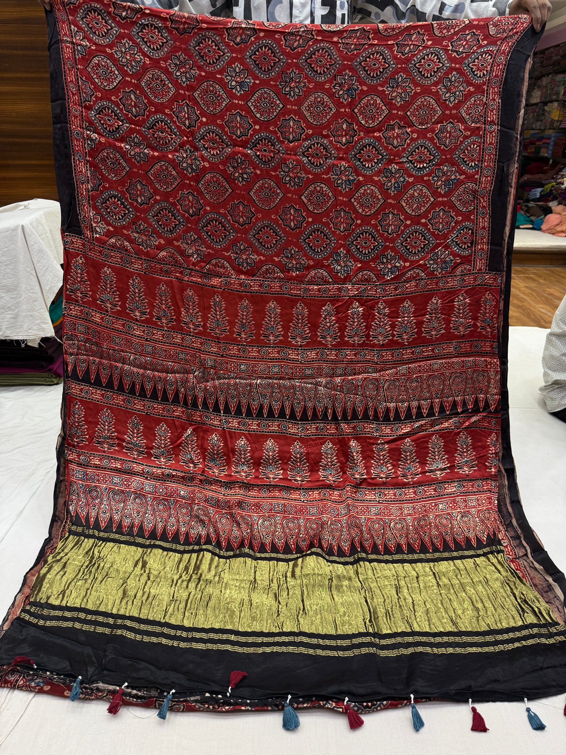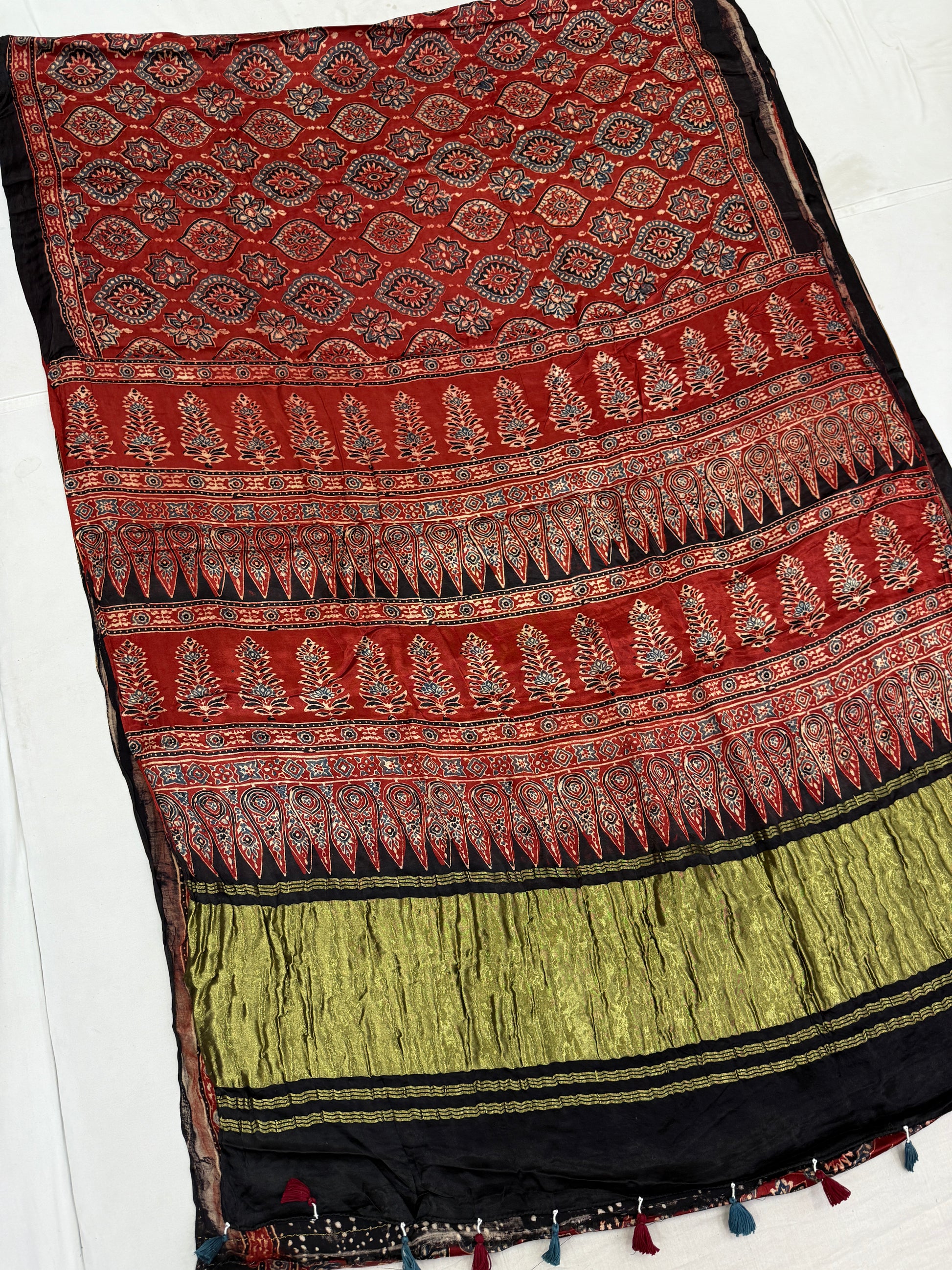 Natural dyed ajrakh modal satin silk saree with lagdi zari pallu.