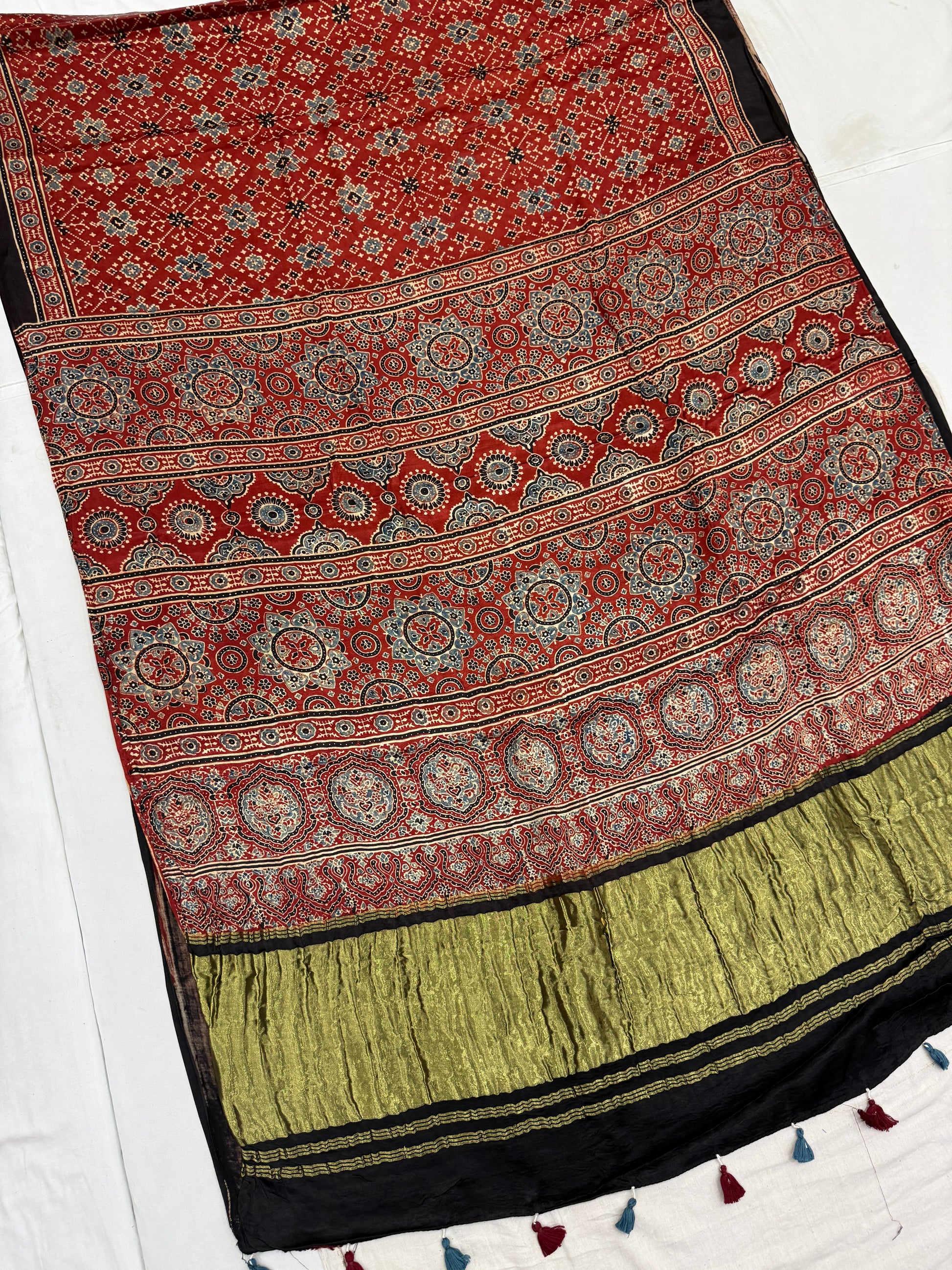 Natural dyed ajrakh modal satin silk saree with lagdi zari pallu.
