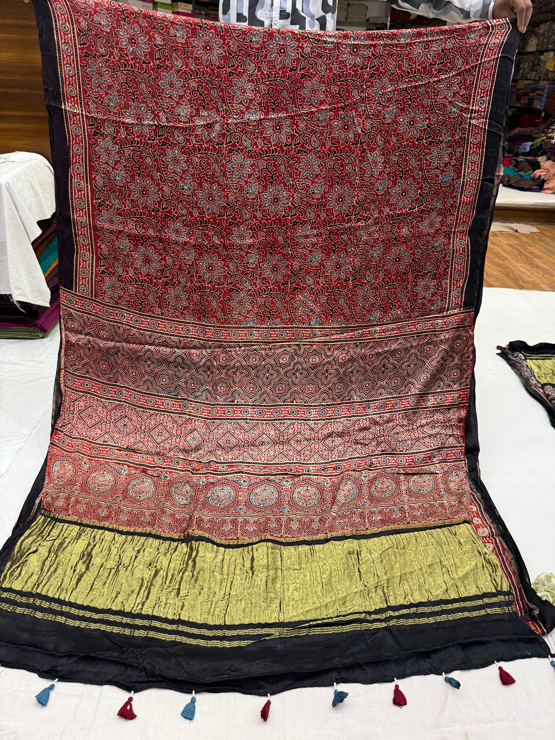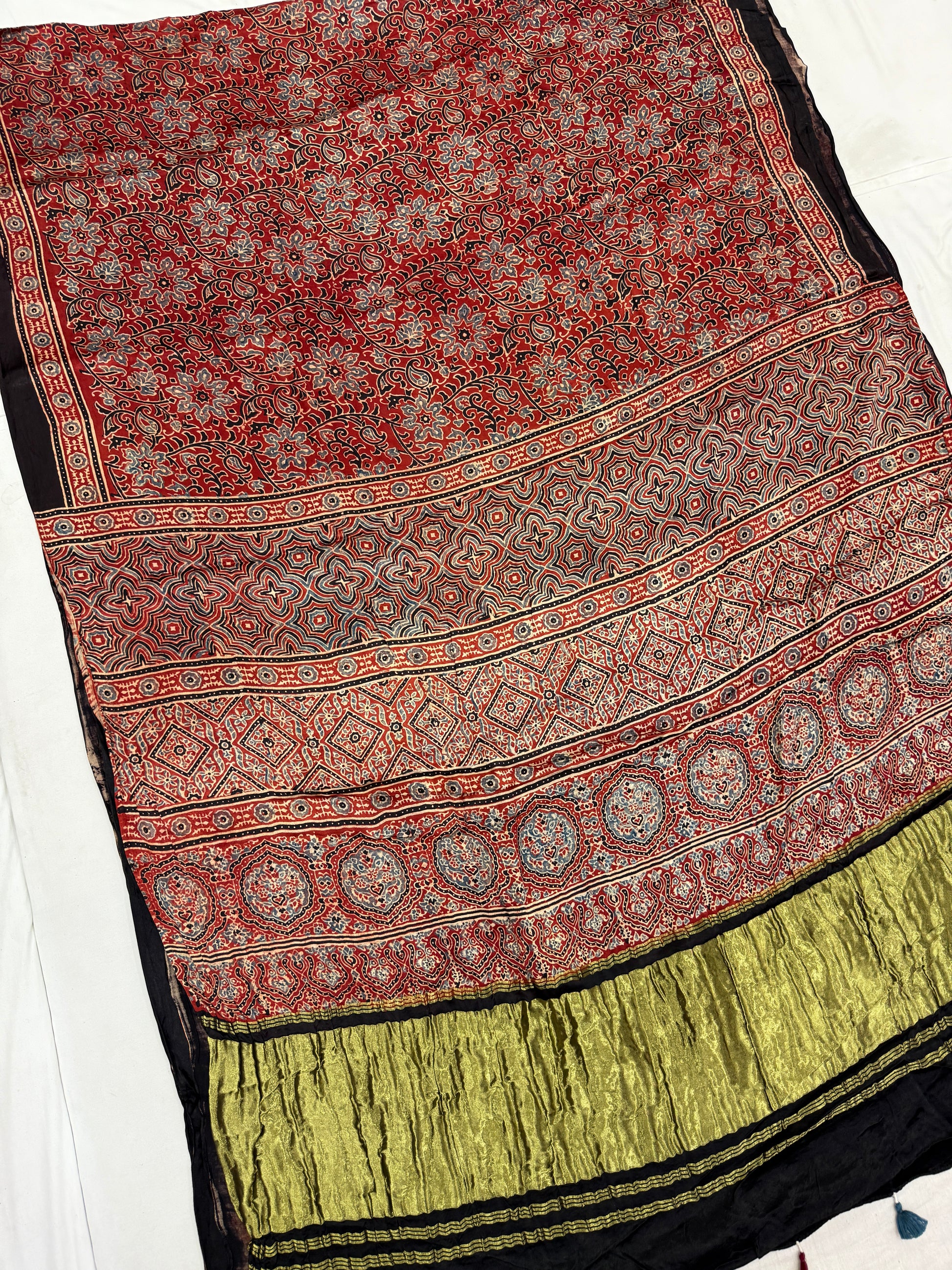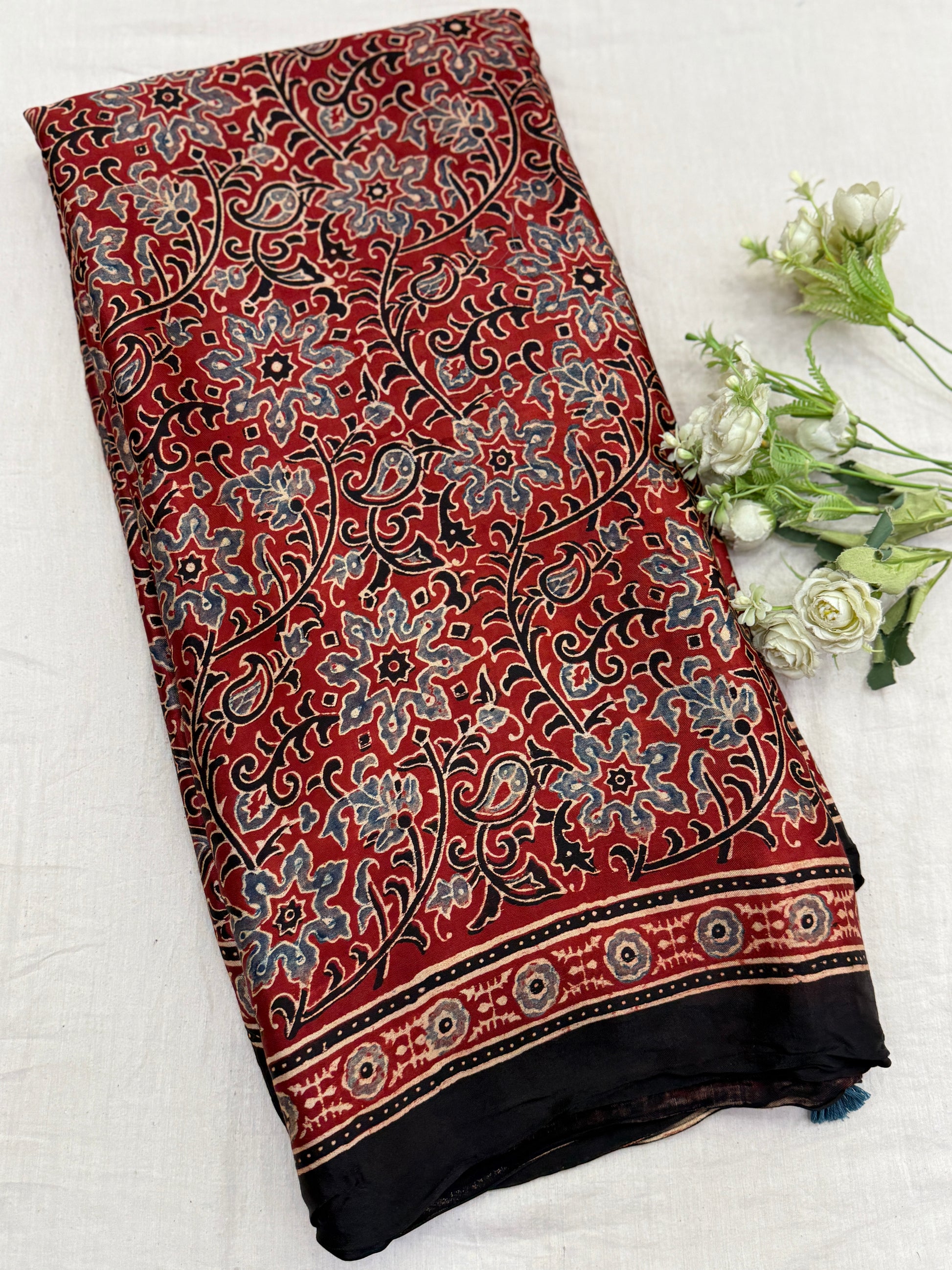 Natural dyed ajrakh modal satin silk saree with lagdi zari pallu.