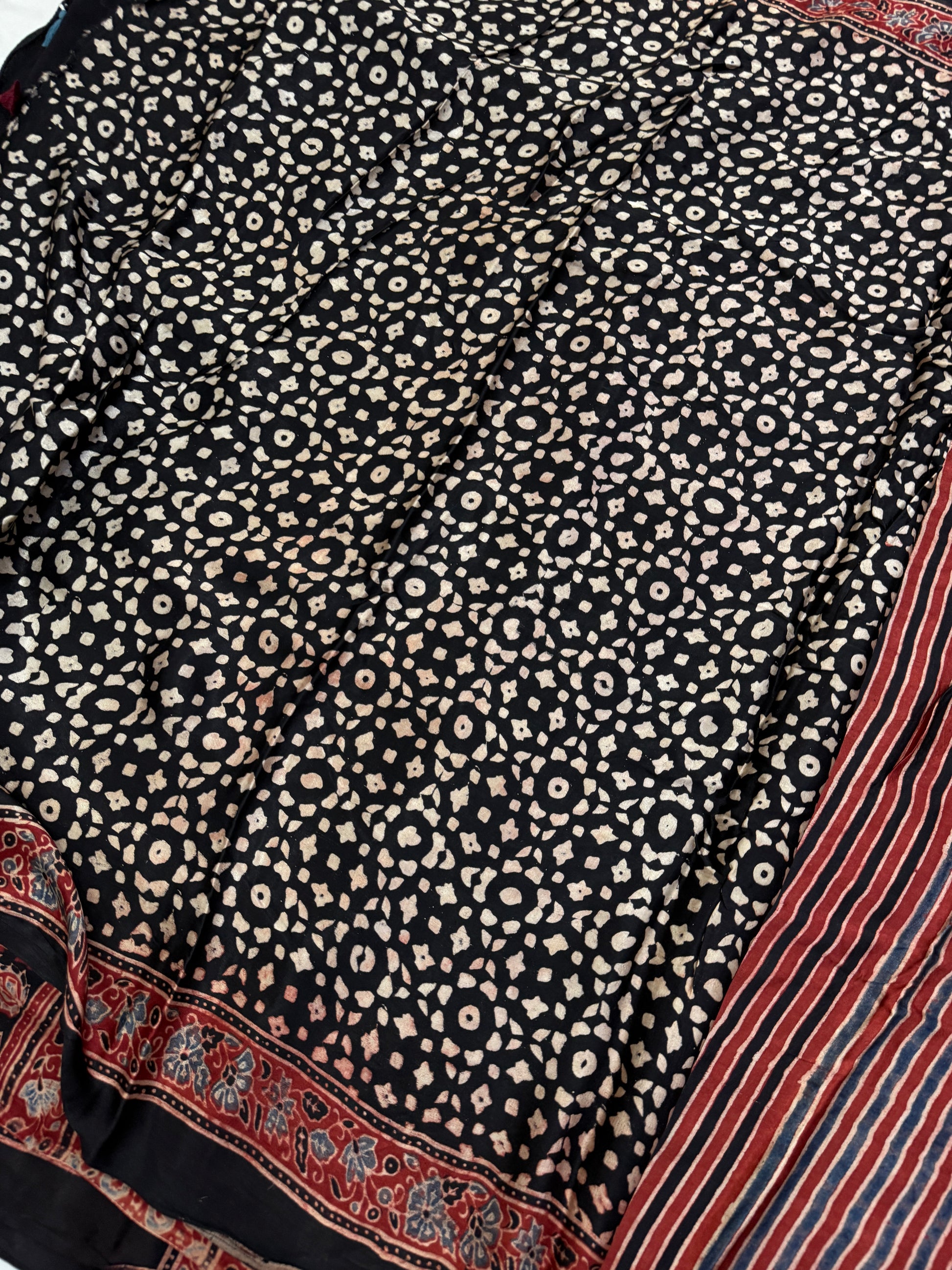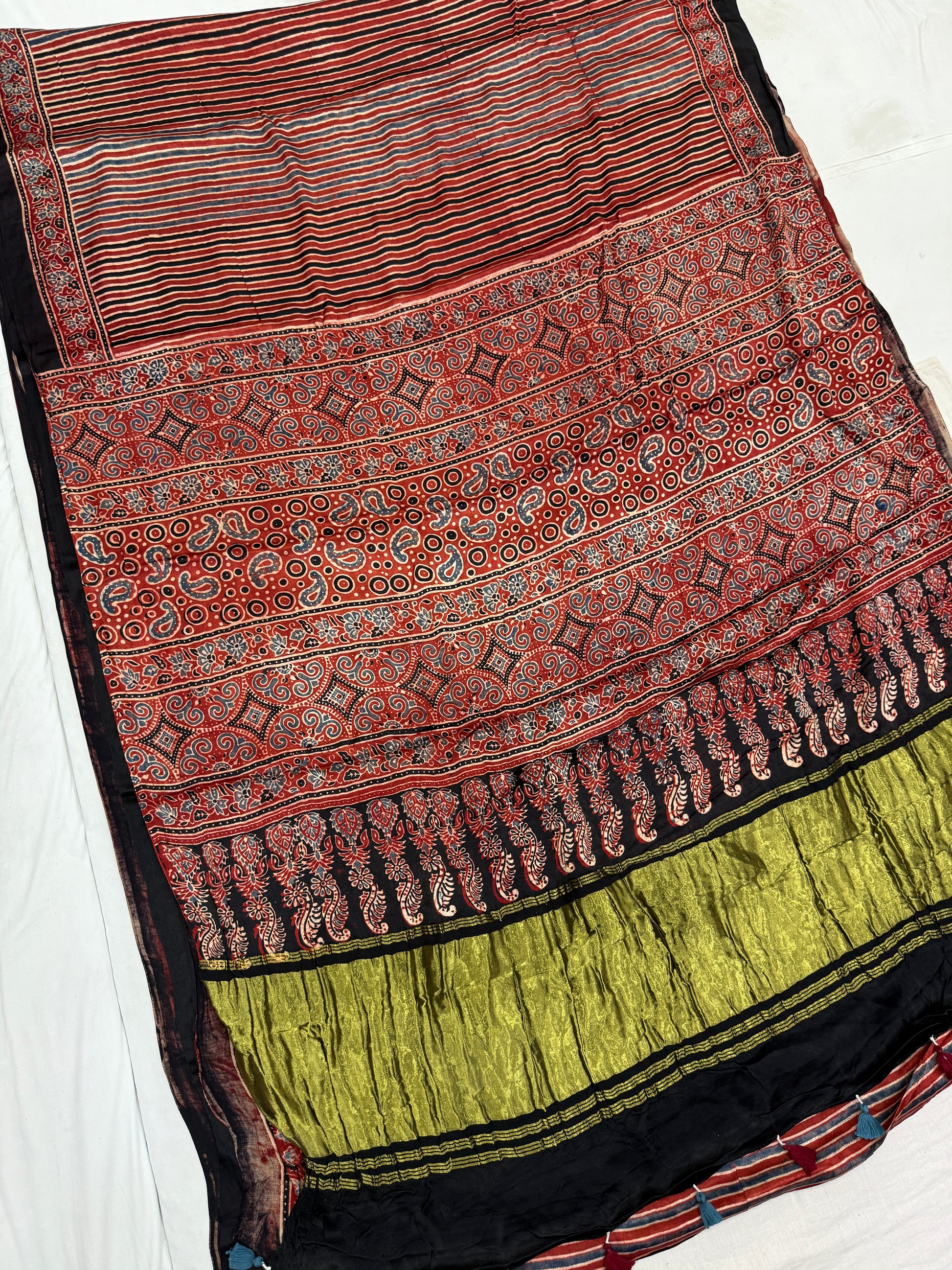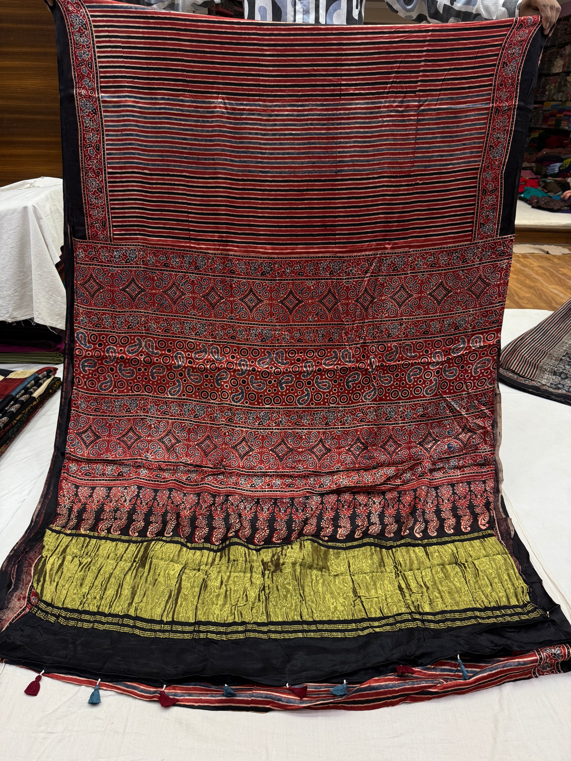 Natural dyed ajrakh modal satin silk saree with lagdi zari pallu.