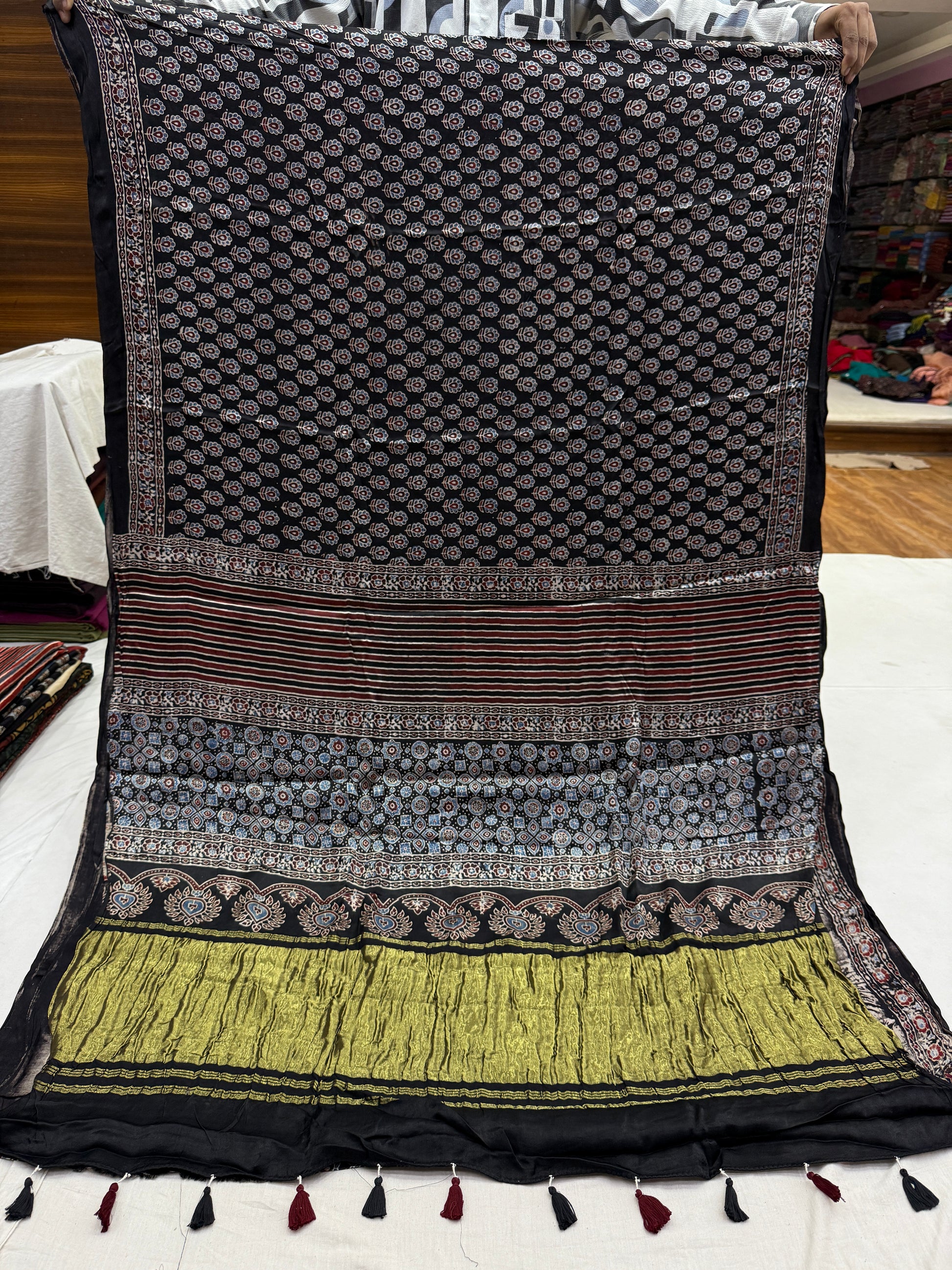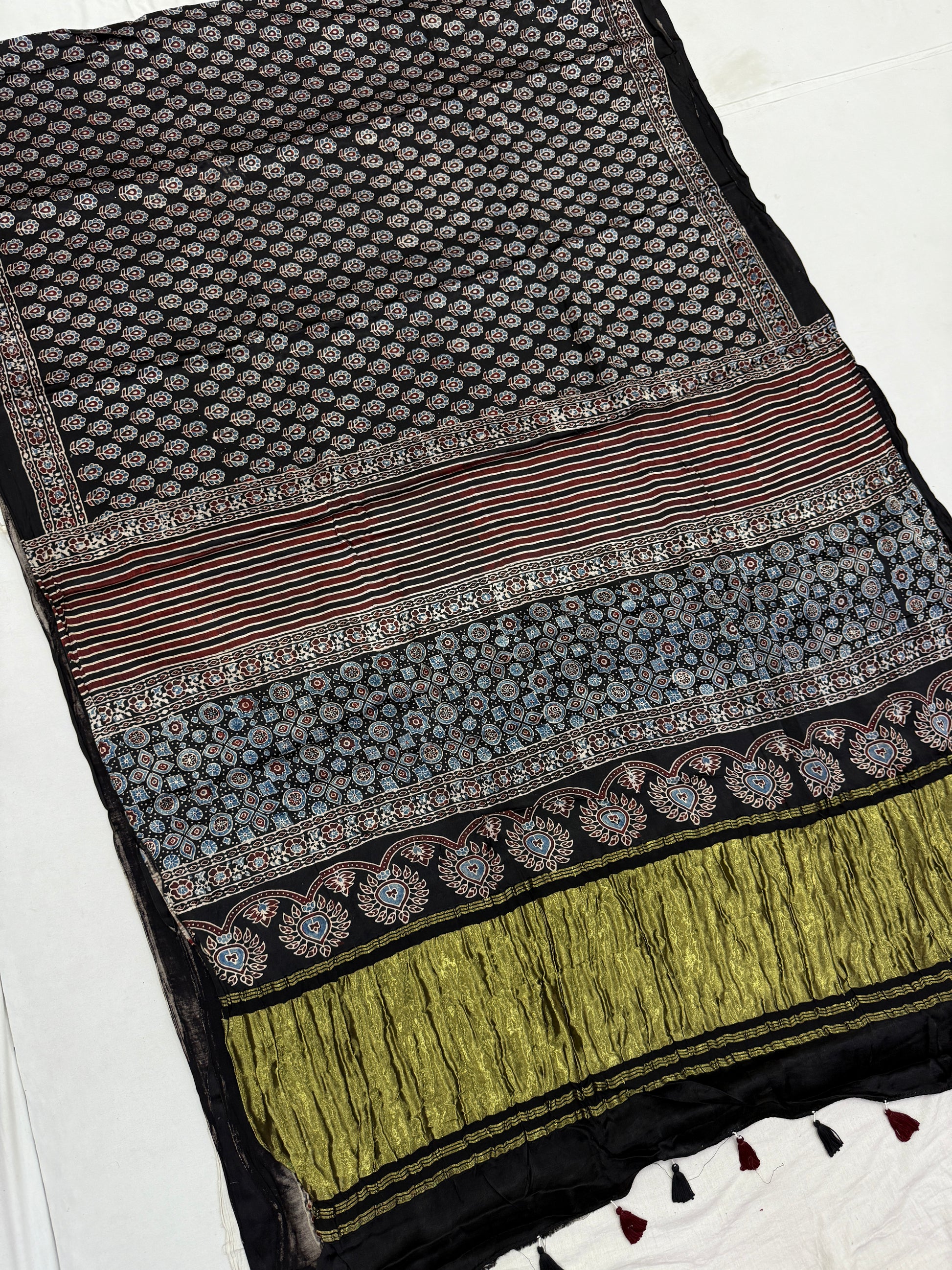 Natural dyed ajrakh modal satin silk saree with lagdi zari pallu.