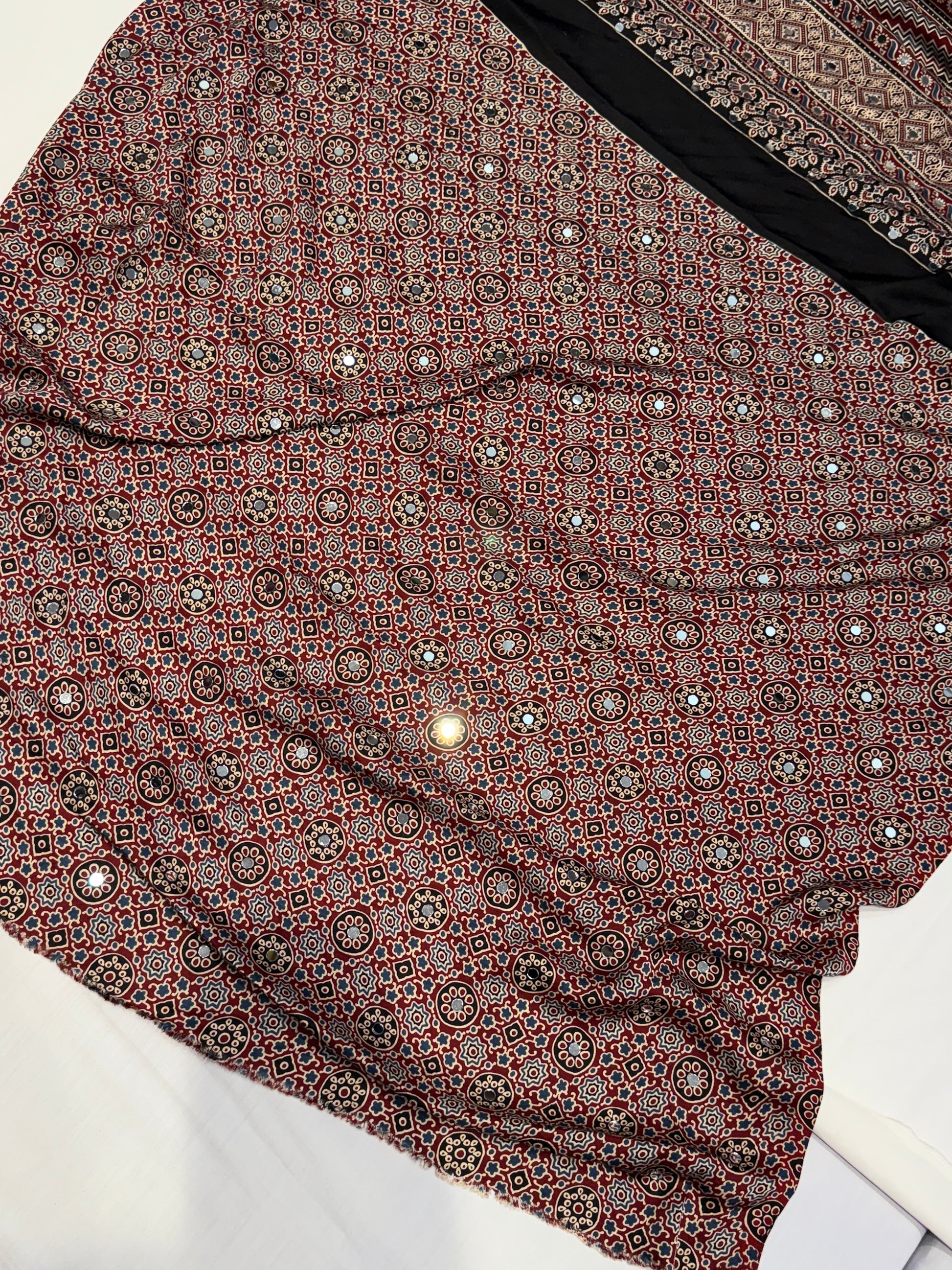 -Blouse: Comes with a matching ajrakh printed blouse piece(unstitched) as of second image.