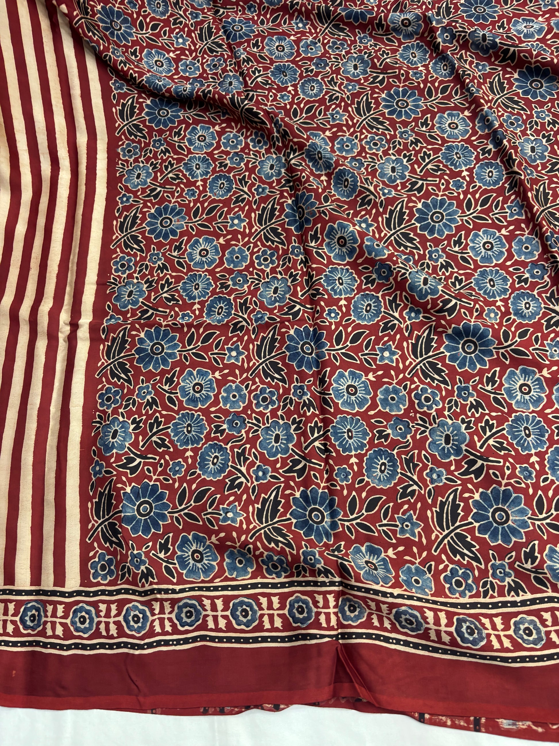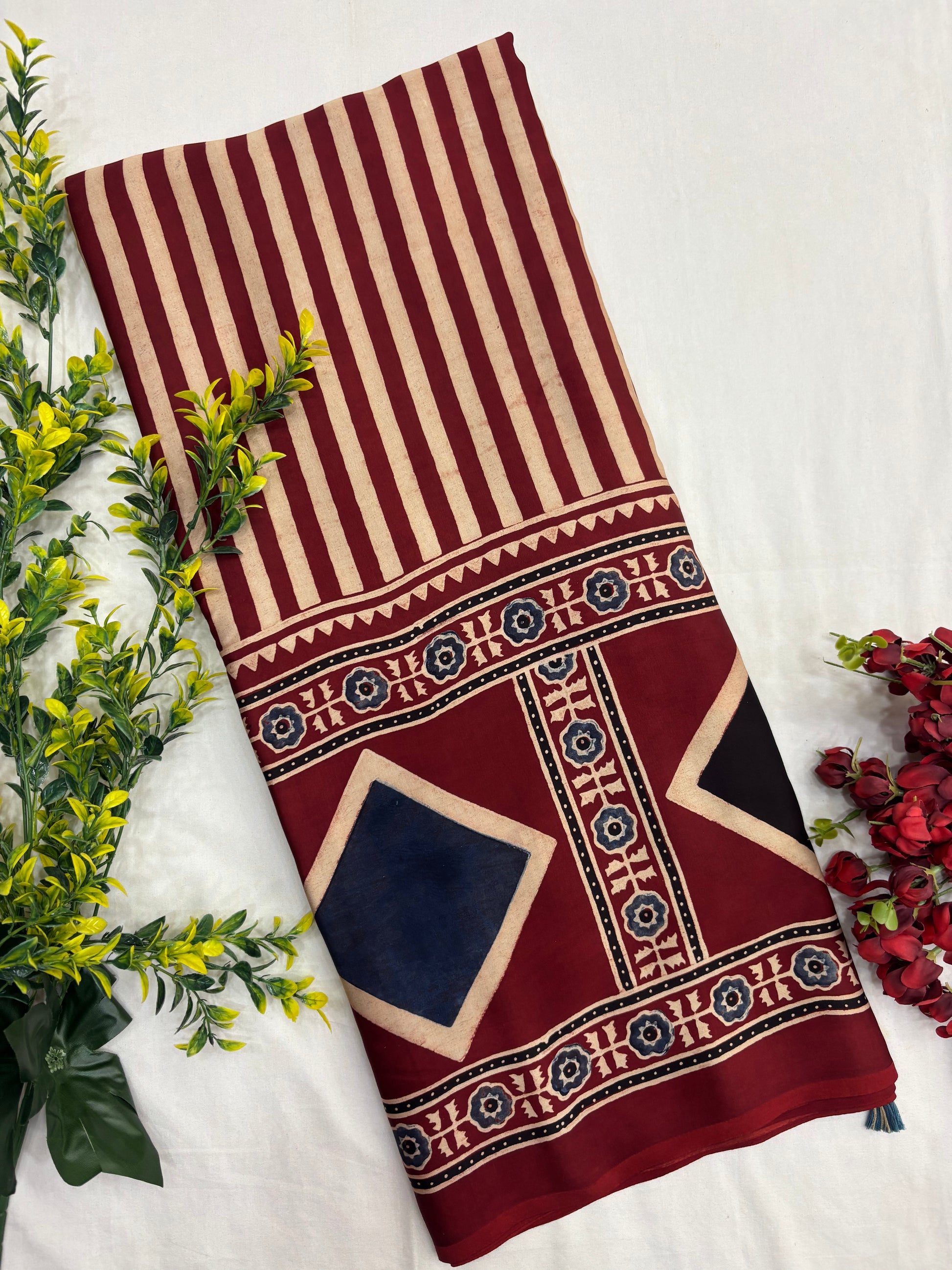 Mehroon Rekha Ajrakh Modal Silk Saree