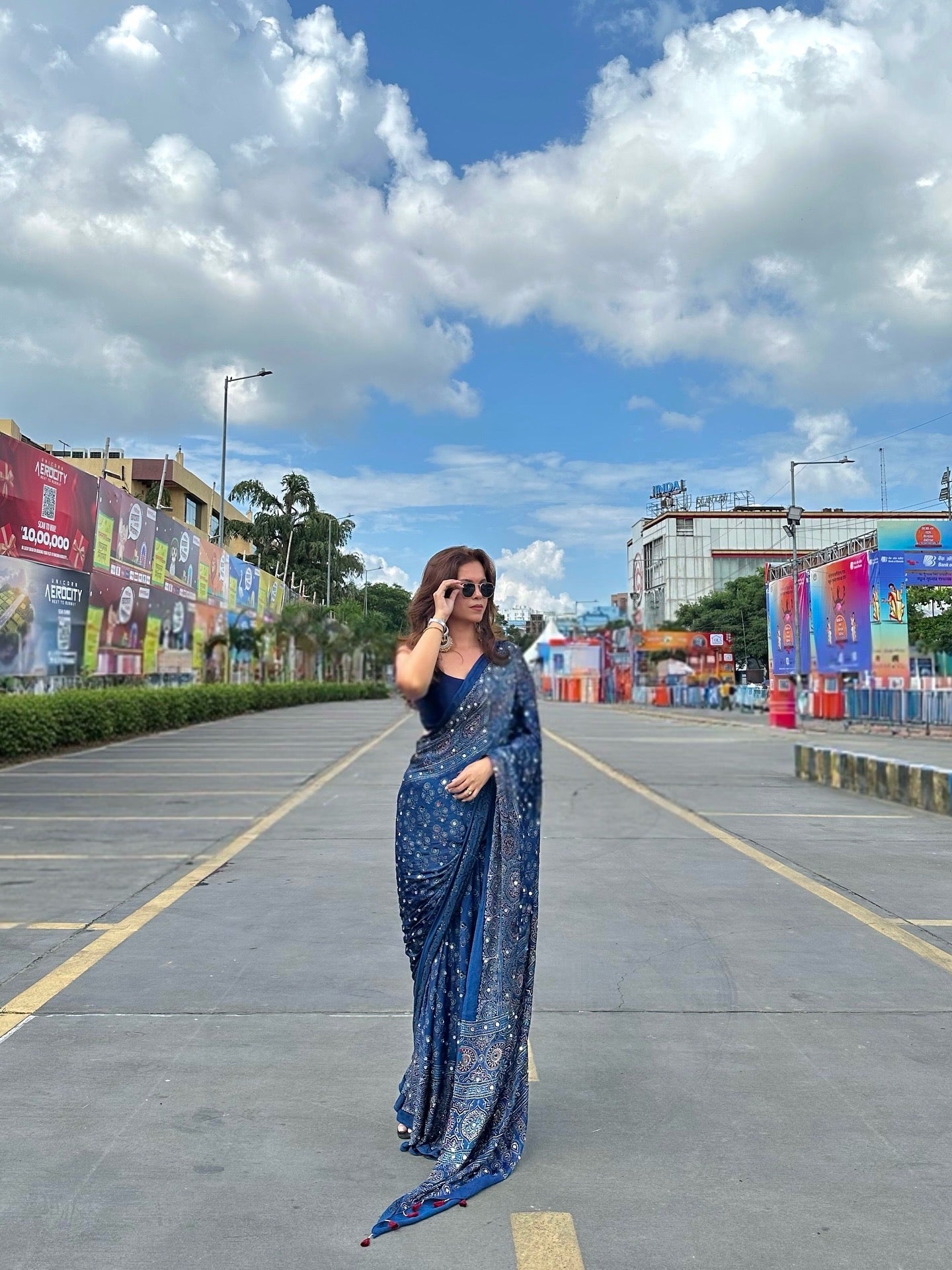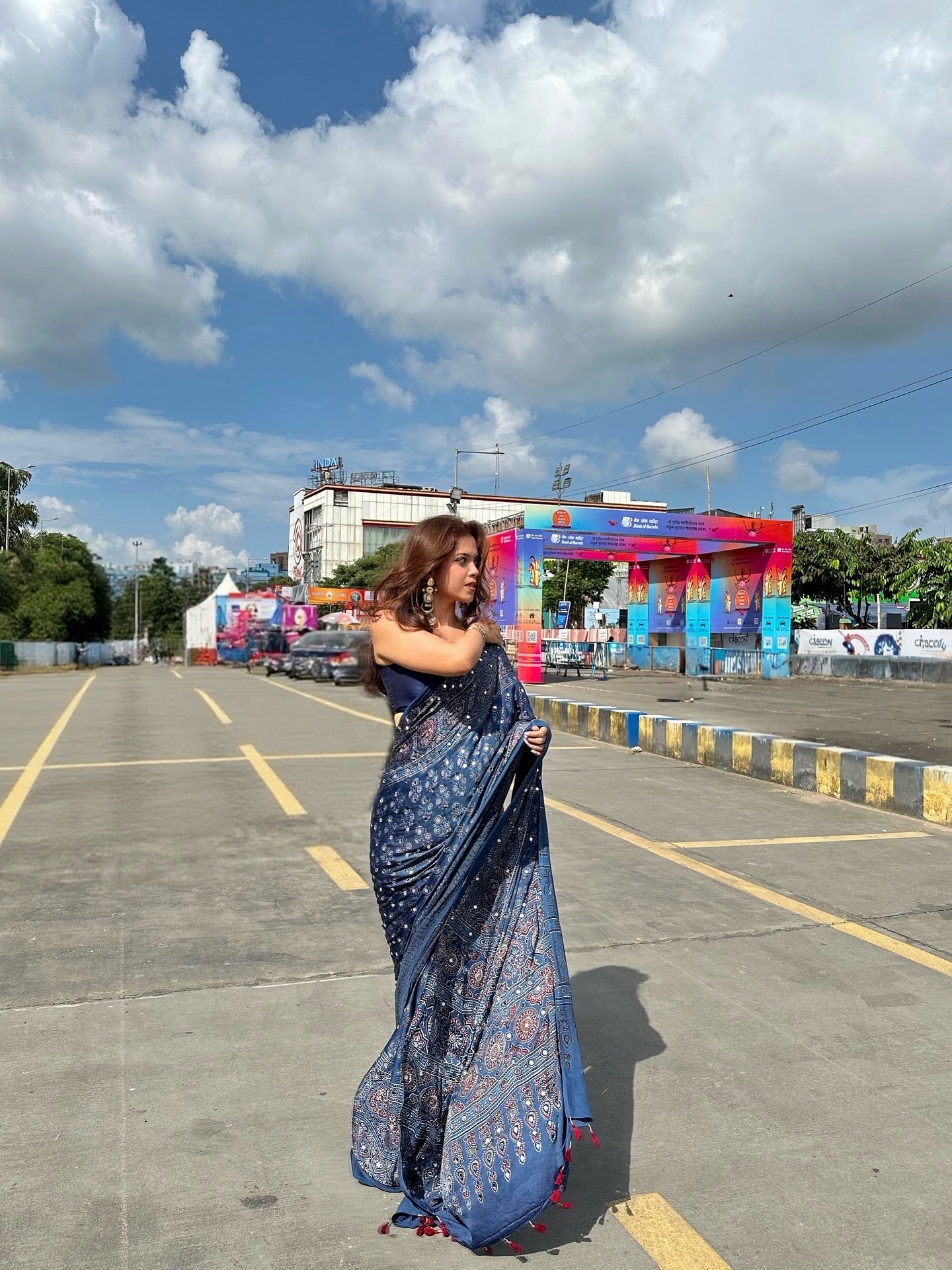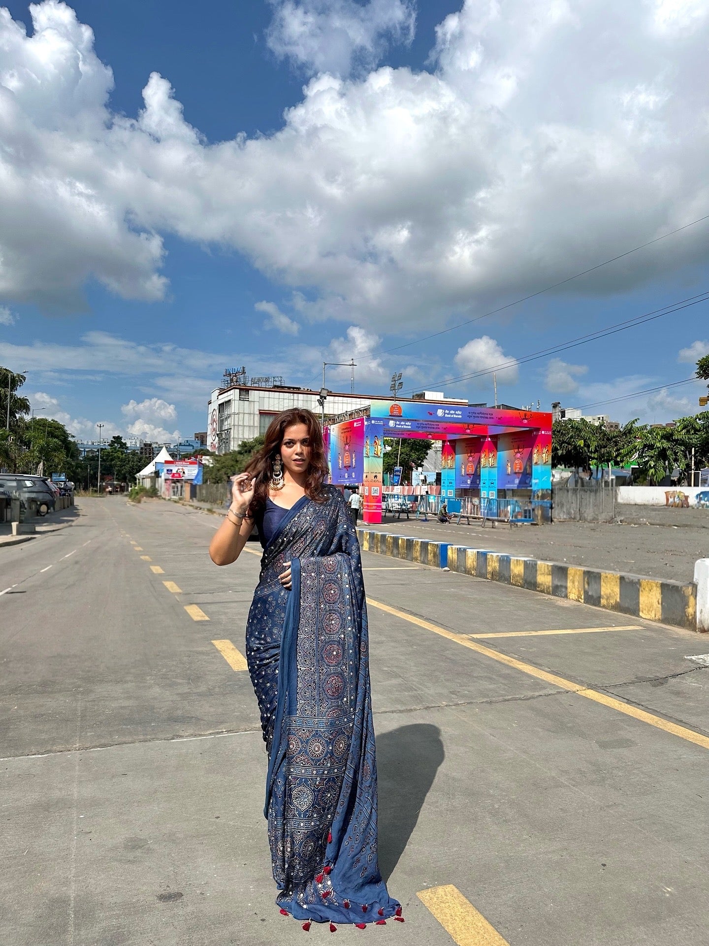 Neel Tara Pure Ajrakh Modal Silk Glued Mirror Saree (20th Nov)