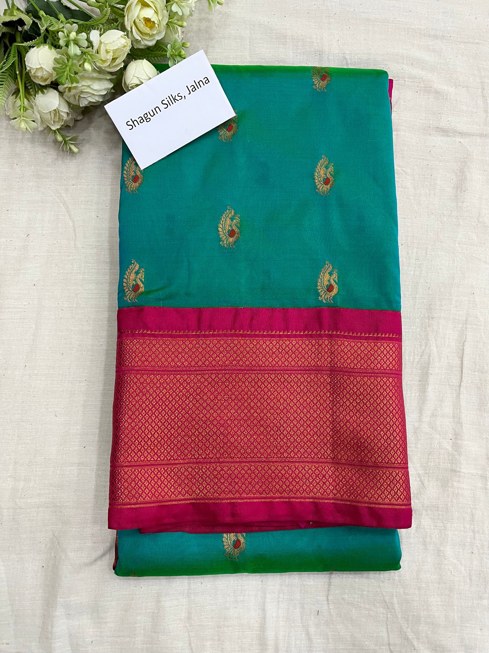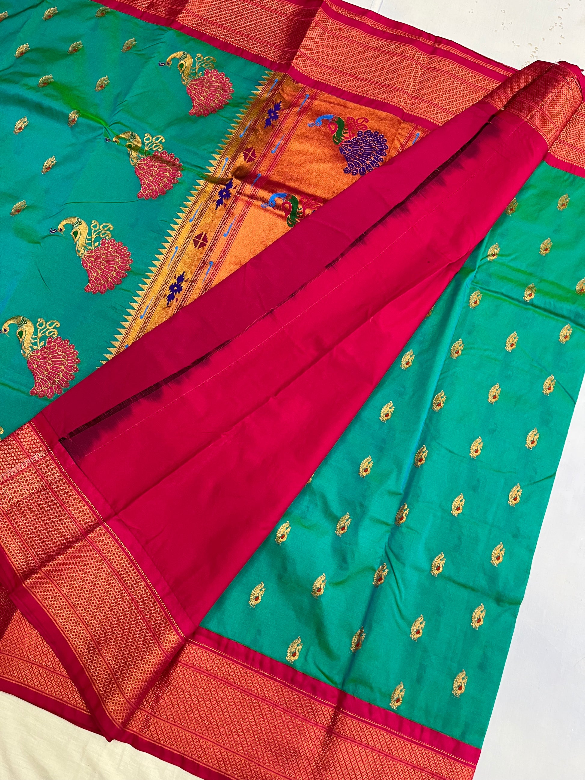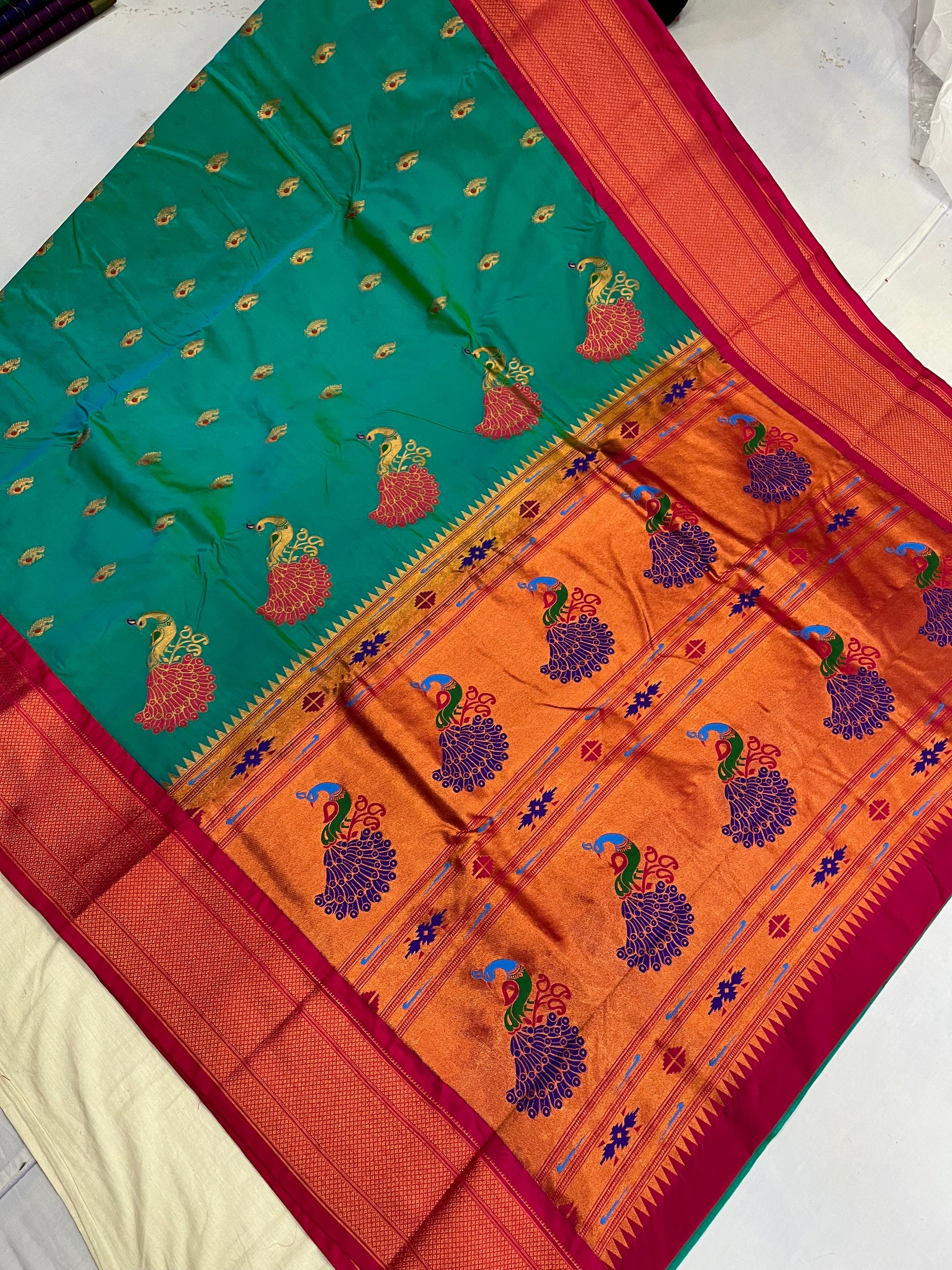 Chintamani cross red Semi paithani silk saree with all over peacock motifs through out the saree and pallu enriched with the dancing peacock.