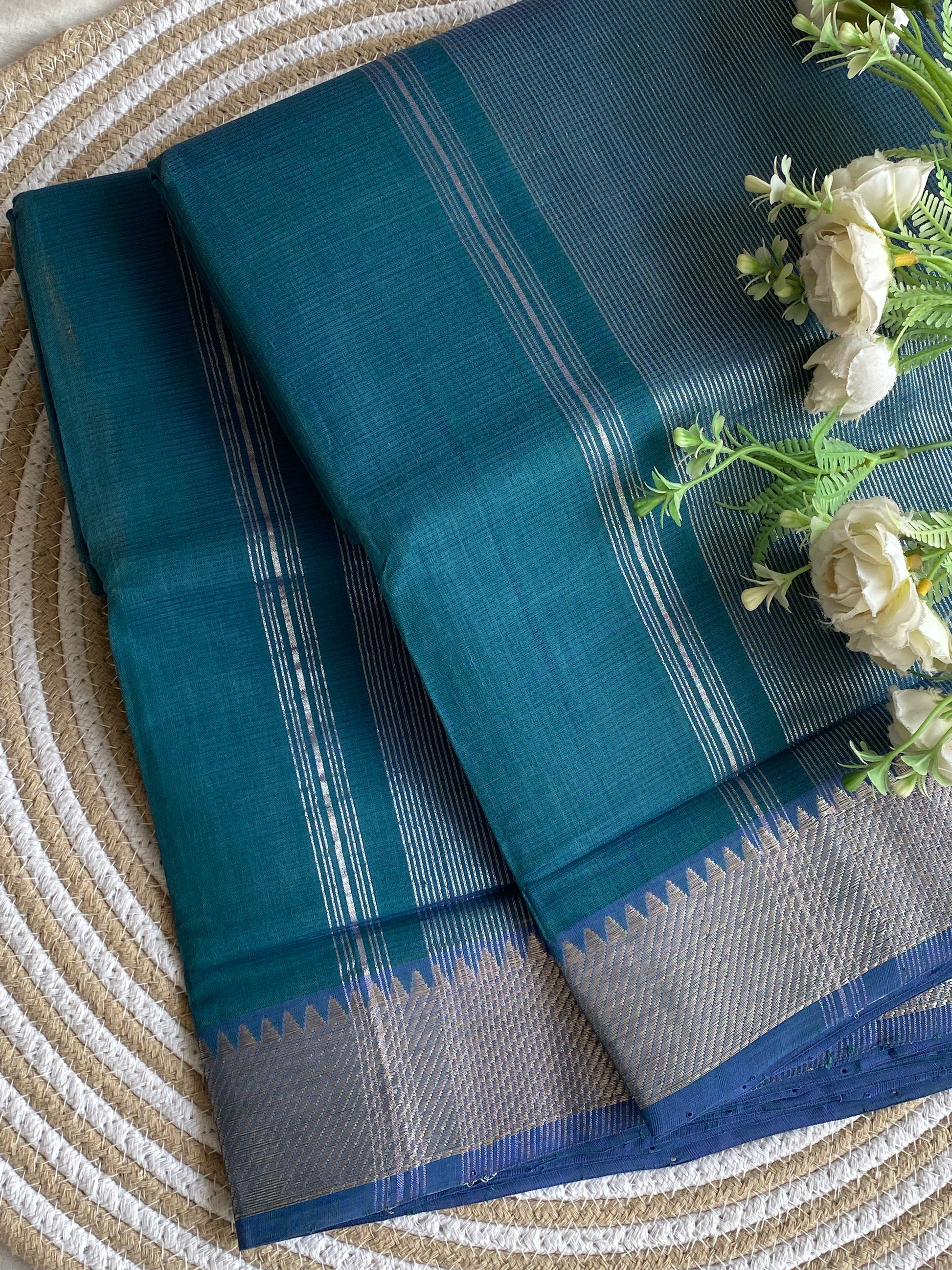 The Silver Border Mangalgiri Cotton Saree is a perfect blend of understated elegance and traditional craftsmanship. Woven in fine Mangalgiri cotton, this saree is lightweight, breathable, and ideal for everyday grace as well as refined festive wear.