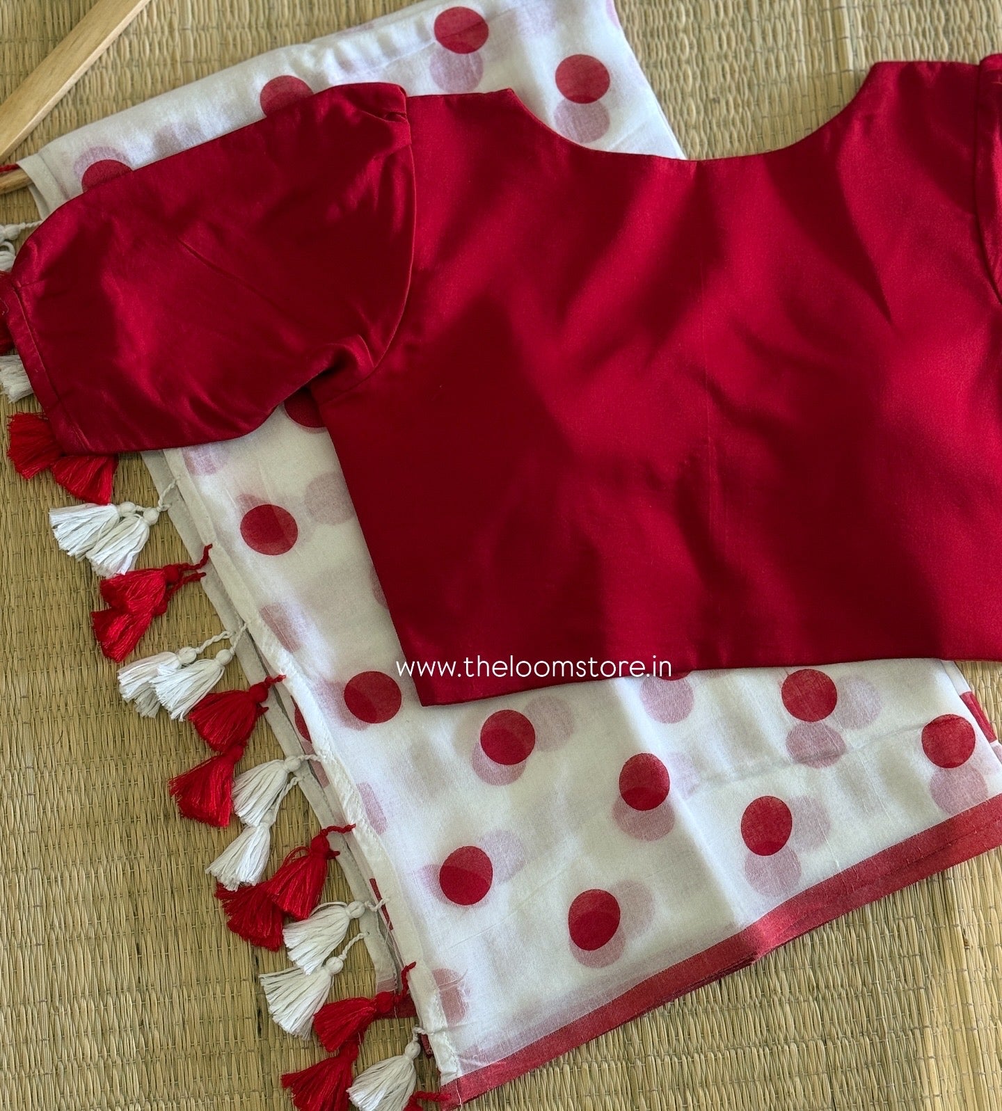 Celebrate the season in comfort and charm with our Snowberry Dots Mulmul Cotton Saree, a lightweight, breathable drape designed for effortless festive styling. Made from premium mulmul cotton, this saree features soft red polka dots, delicate tassels, and a flowy texture that keeps you comfortable all day.
